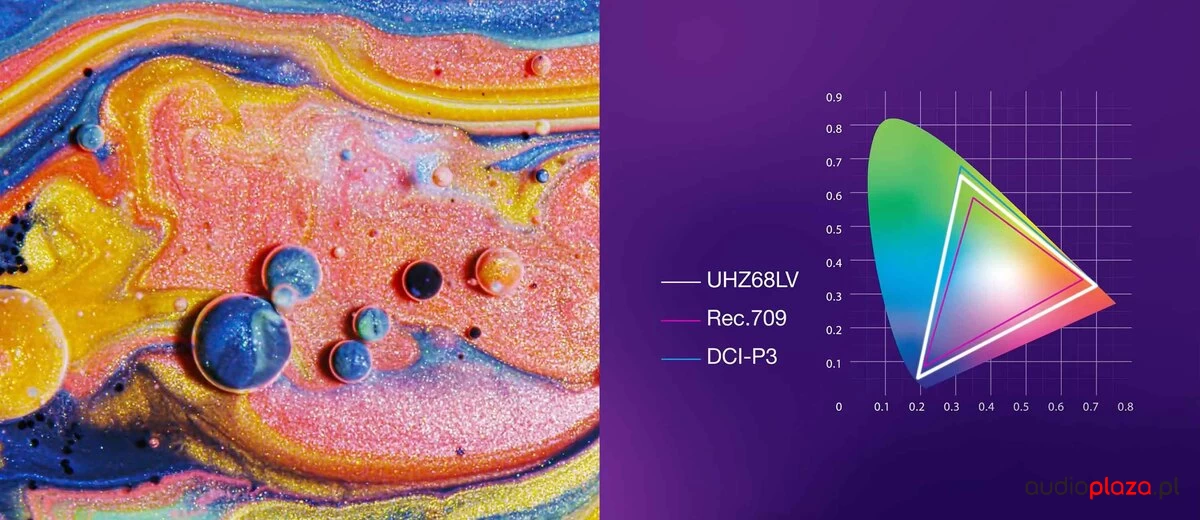 UHZ68LV, z technologią Dual Laser, zapewnia niezrównane odwzorowanie kolorów (95% DCI-P3) i najwyższą rozdzielczość, oferując do 30 000 godzin nieprzerwanej pracy. Dzięki PureEngine™ Ultra i precyzyjnej kalibracji kolorów, projektor dostarcza oszałamiającą jakość obrazu, płynny ruch i wyrazistość, wypełniając ekran wciągającymi efektami wizualnymi.