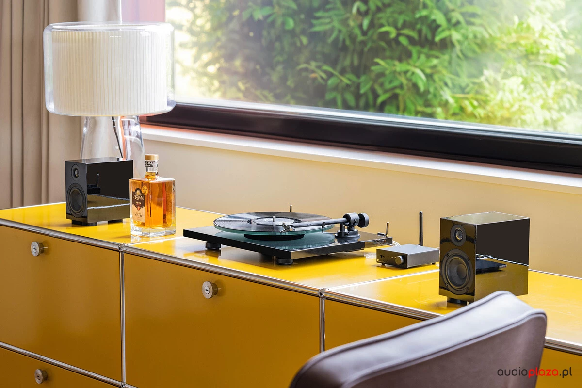 Podstawa gramofonu wykonana została z frezowanego MDF-u, bez pustych przestrzeni i plastikowych elementów. Taka konstrukcja zapewnia wysoką sztywność i skuteczne tłumienie drgań. Antywibracyjne nóżki dodatkowo izolują gramofon od drgań przenoszonych z podłoża. Urządzenie dostępne jest w trzech wariantach wykończenia: czarny połysk, satynowa biel oraz naturalny orzech.