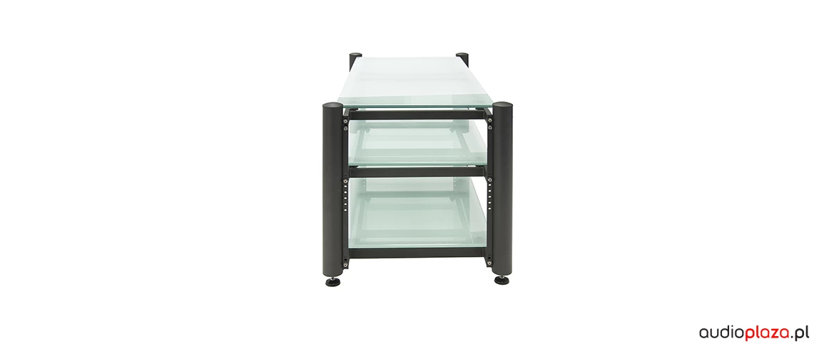 Wysokość półek można regulować dzięki prowadnicom z otworami, co pozwala na łatwe dopasowanie stolika do różnych konfiguracji sprzętowych. Każda półka wykonana jest z podwójnych tafli szkła o grubości 6 mm, które zostały poddane specjalnej obróbce od wewnątrz w celu zwiększenia trwałości i odporności na rezonanse.